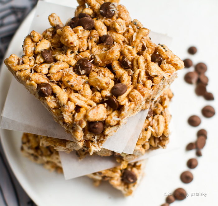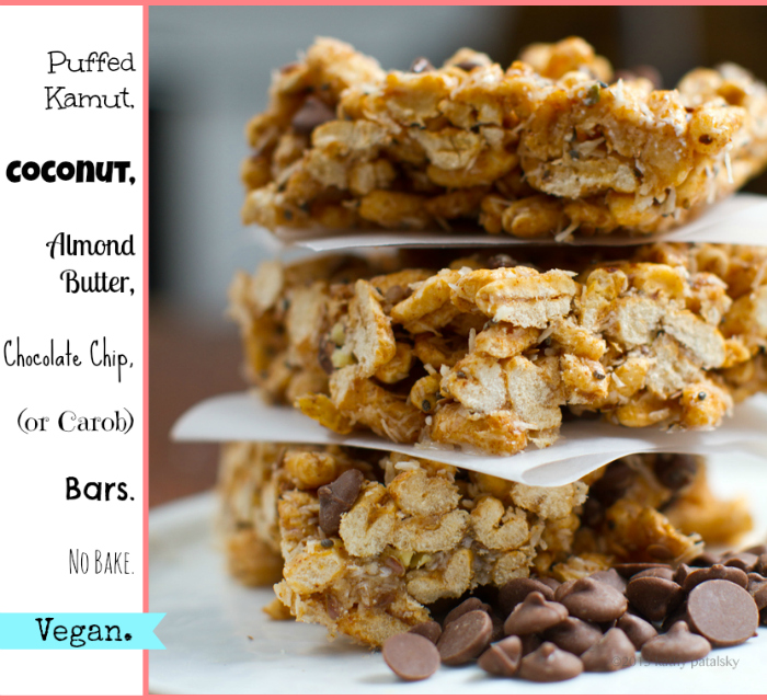 These puffed cereal squares are light and crisp with the earthy, nutty flavor of puffed kamut in every bite. The bars are infused with almond butter, coconut, a hint of cinnamon and your choice of chocolate-y chip. This no-bake recipe is fast and easy. A healthy substitute for "marshmallow squares" or super sweet granola bars. Just a touch of brown rice syrup is all you need for these bars. Grab my recipe + get 5 reasons why one might choose CAROB chips instead of chocolate!..