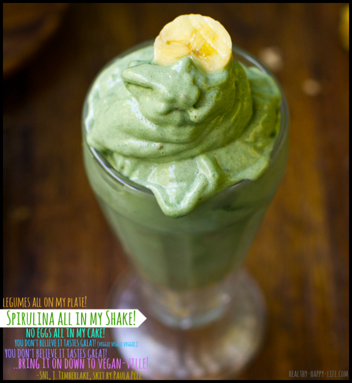 Am I the only one who still LOVES it? I cannot stop replaying that SNL Justin Timberlake "Vegan-ville" skit in my head. The lyrics keep getting stuck in my head and now I just have to sing "Spirulina all in my shake!" as I sprinkle my spoonful of spirulina into my shakes and smoothies. (SNL skit video is embedded later in this post)