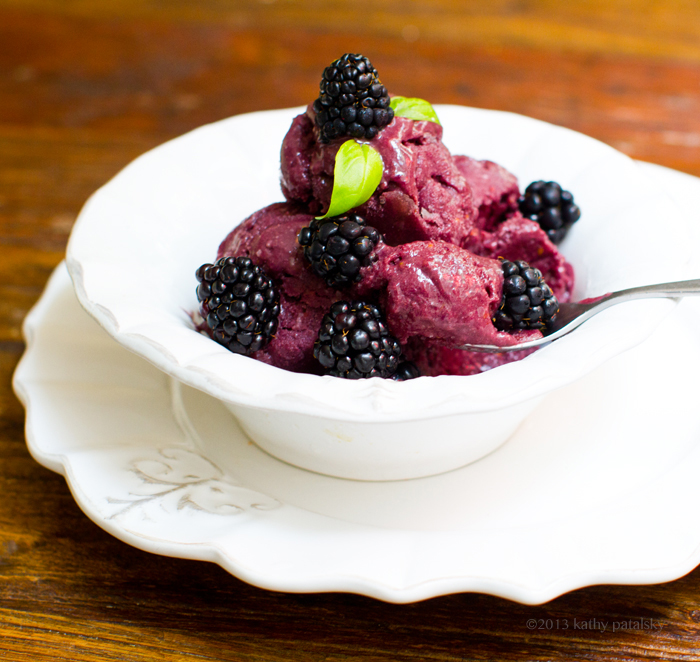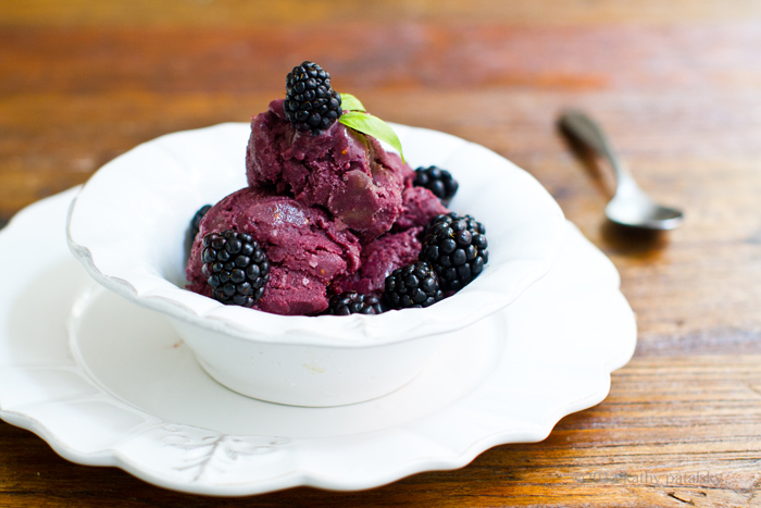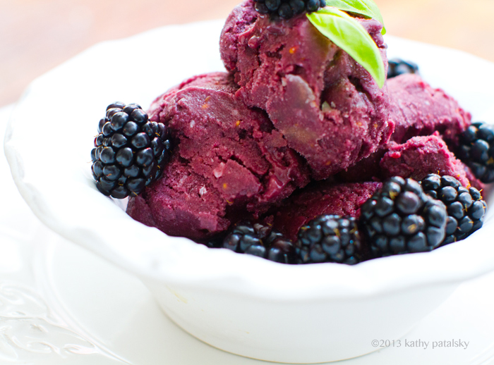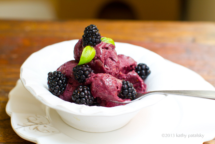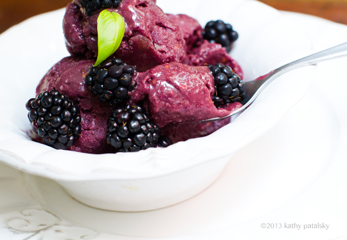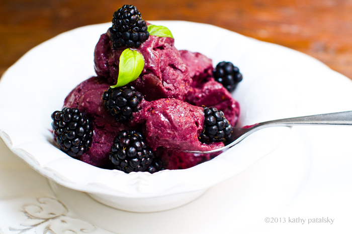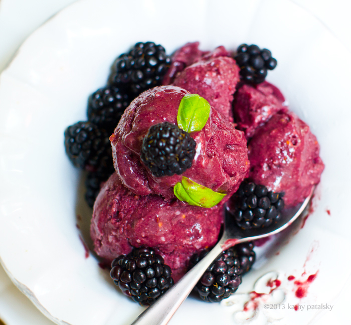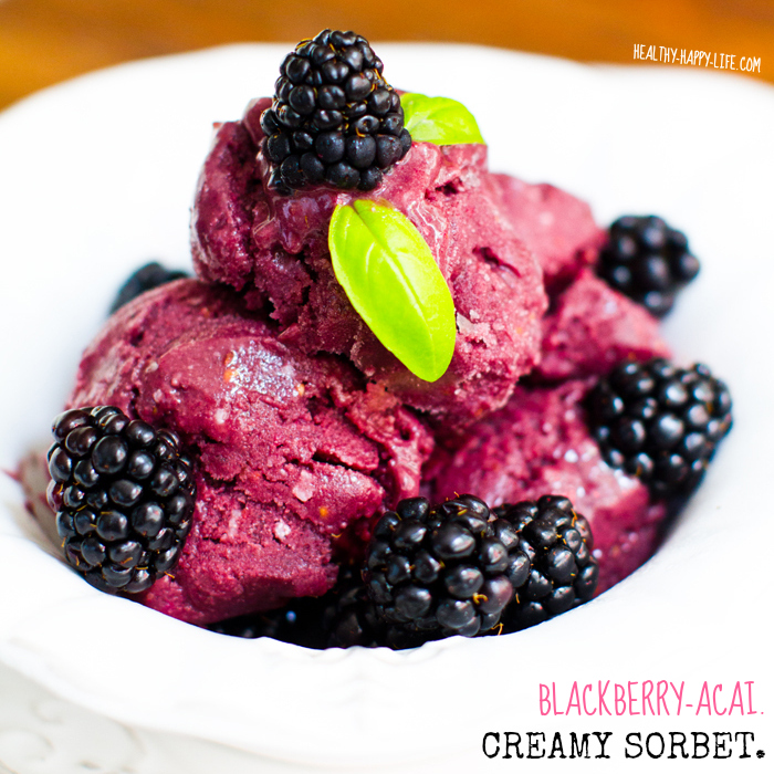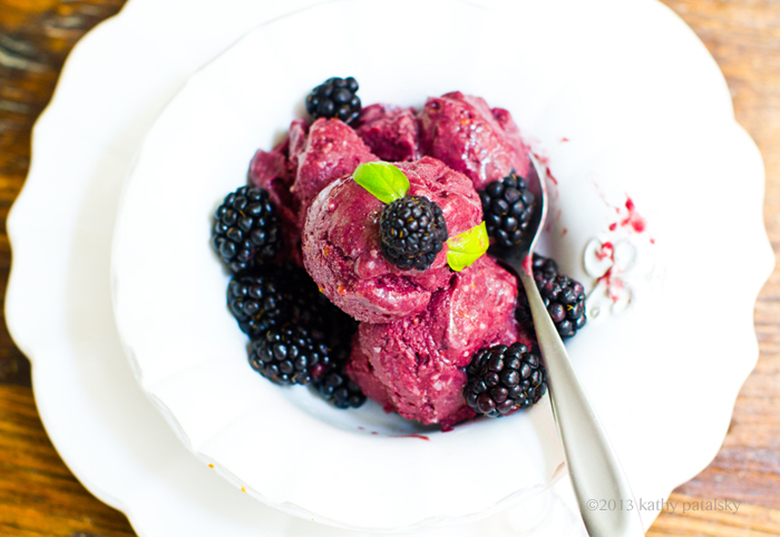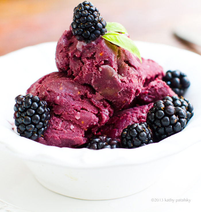 Plus the fresh blackberries add a juicy quality to the sorbet rather than frosty and icy. Since you only soft-serve freeze the sorbet before serving, the blackberries stay quite juicy and creamy in the mixture. And that juice also helps the blend churn in your blender. (important to the success of the recipe)