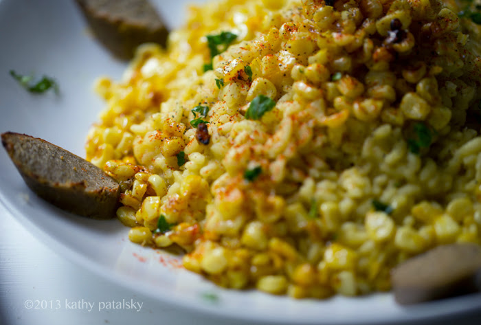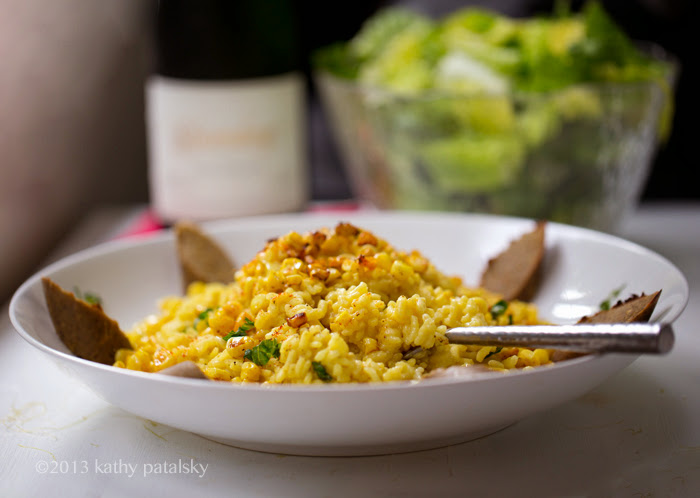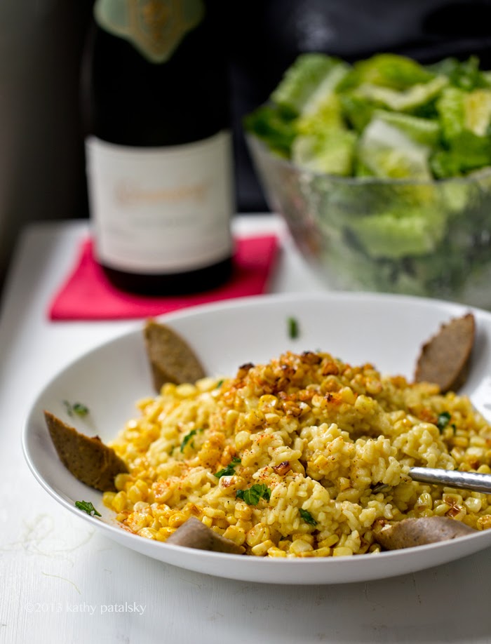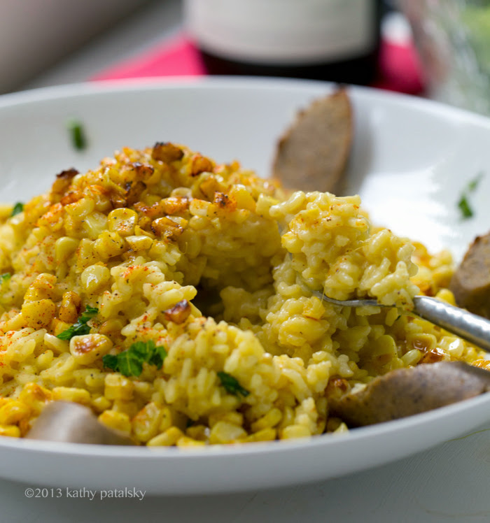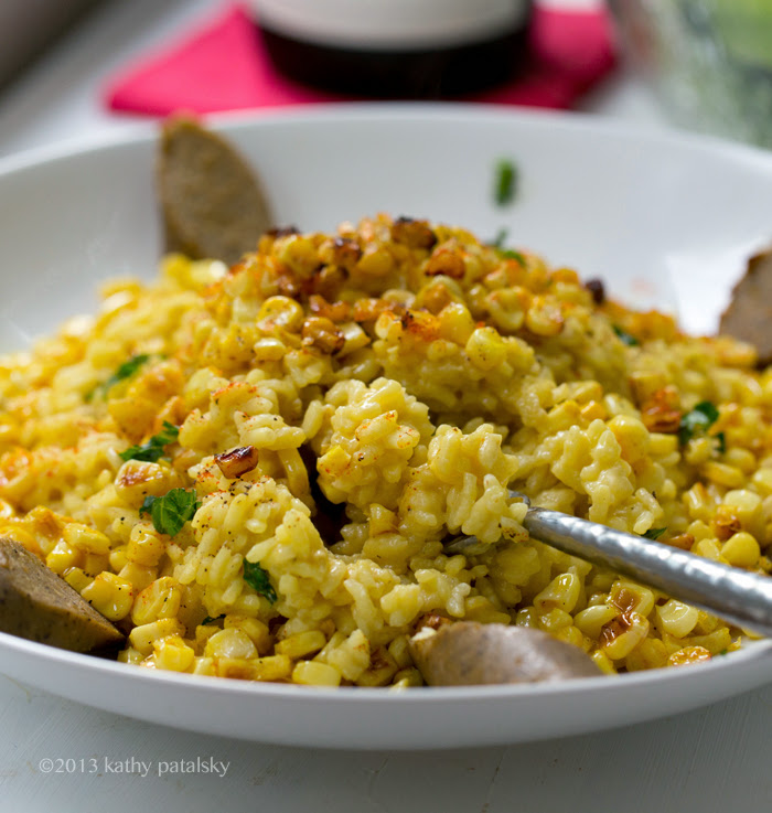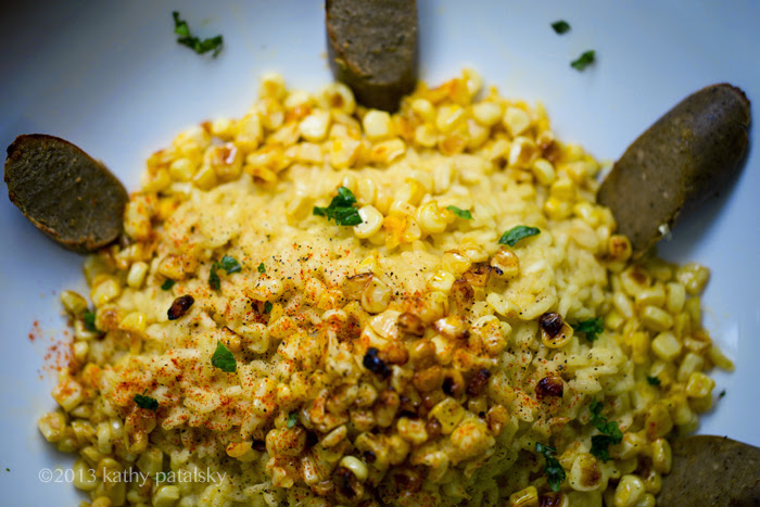 3. Place the corn in the oven and bake for about ten minutes. Then turn oven to broil and broil for another 2-3 minutes - watching closely so the kernels do not burn (or start popping! As one of mine did.) When the kernels start to blacken around a few edges, turn heat off and let them sit in the hot oven while you prepare your risotto. **If adding "Beer Brats" you can slice and bake in the oven alongside the corn.