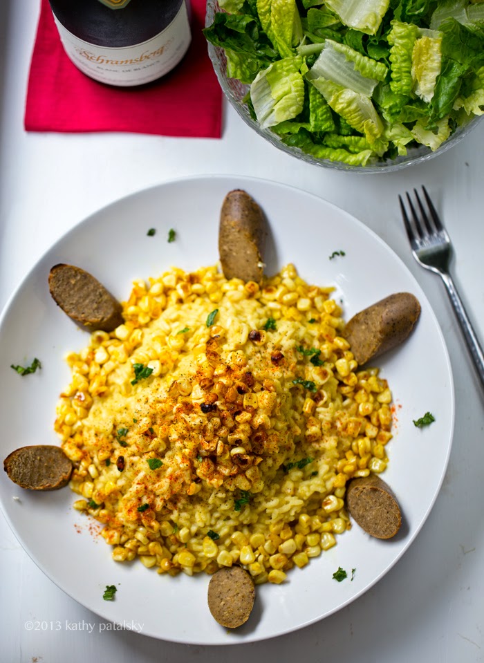 7. To plate, add the risotto to a shallow bowl and top with plenty of roasted corn. Add some parsley and cayenne as desired. Add optional vegan "Beer Brat" slices to plate as desired.