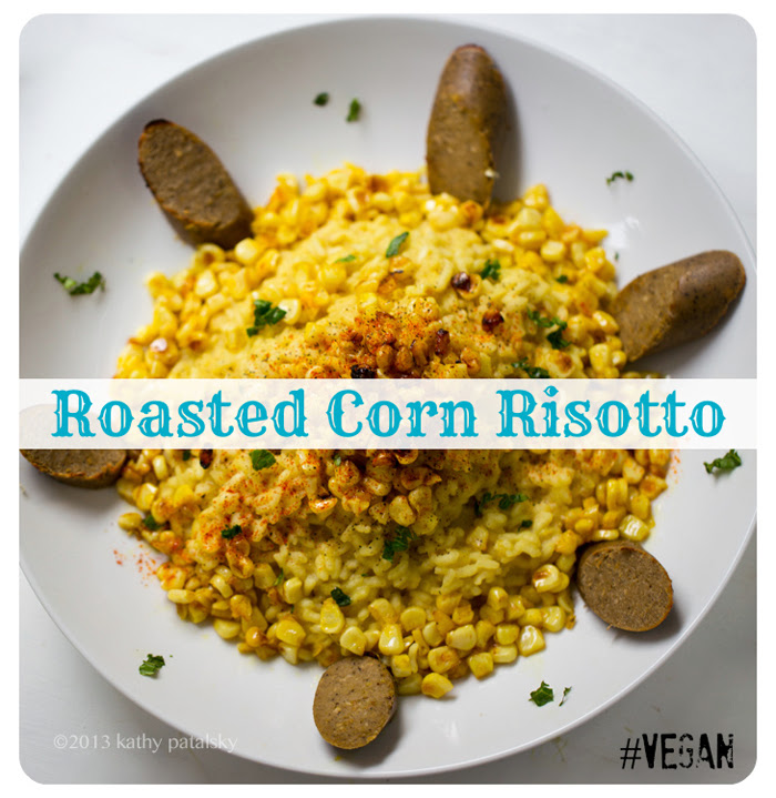 This Sweet Roasted Corn Risotto is warm, creamy and dreamy with "cheezy" accents in each golden risotto bite. The silky, nutty rice is topped with a pile of steamy, buttery, sweet roasted summer corn. A pinch of freshly chopped parsley, dash of cayenne on top. I added some vegan "Beer Brat" slices to the plate as well, for extra protein. This simple-ingredient recipe tastes elegant, fancy yet farm-fresh and inspired for summer. Grab some arborio rice and an ear or fresh summer corn and whip up this wonderful dish. Oh and try to save some leftover for my newest obsession recipe!..
