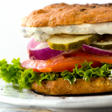 This is a favorite simple vegan sandwich that I love to make. It combines my love of a cream cheese slathered bagel with the heartiness of a fully loaded veggie sandwich. Vegan! Gluten-free option.