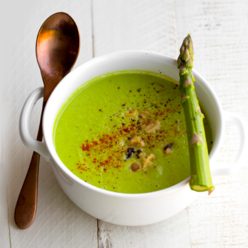 Spring asparagus season is here! And one of my favorite things to do with asparagus is to make soups and dips in my blender! And this super simple recipe is a winner. This is a great way to load up on this very healthy spring veggie.