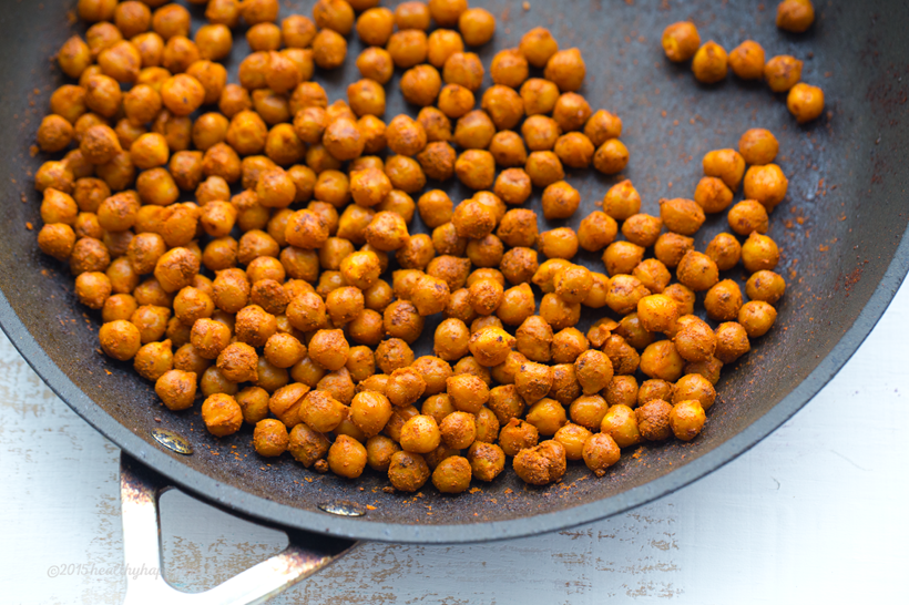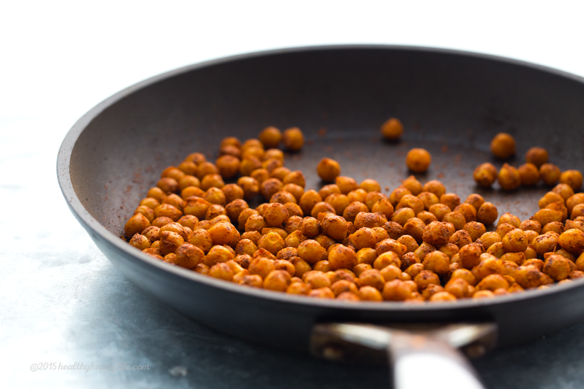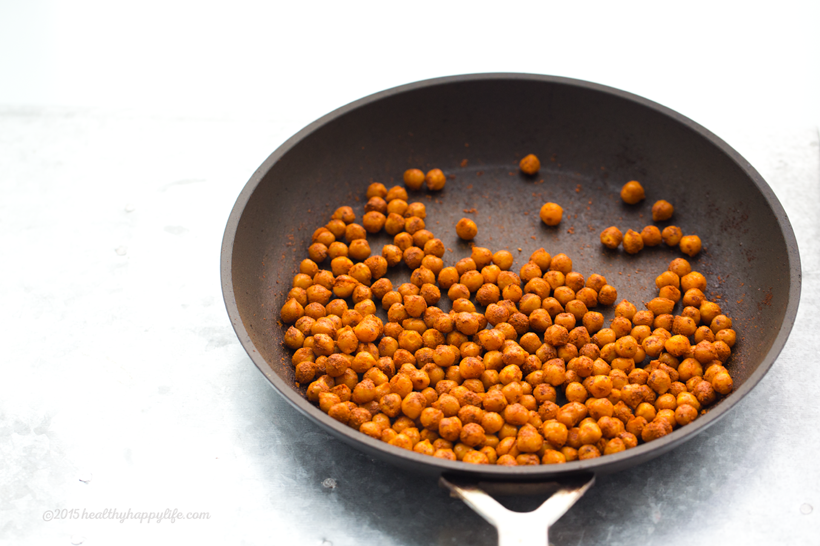 1. Warm a skillet over high heat and add the extra virgin olive oil to the pan. When oil is hot, add in the drained chickpeas. Shake the pan to disperse the oil. Sprinkle half of the spices over top the chickpeas. Let them sit, sizzling in the pan for 1-2 minutes, then shake the pan to disperse the spices - the chickpeas should be nicely coated with the red and yellow spices. Next, add in the lemon juice and maple syrup and shake the pan around again. Add in the other half of the spices and shake the chickpeas to distribute. Keep shaking for the next 2-3 minutes as you allow the chickpeas to cook and brown, absorbing the flavors. When the chickpeas are nicely dark reddish-orange in color and have toasted around the edges a bit - they are done. Sprinkle the coarse sea salt over top - I used fleur de sel. Set aside.