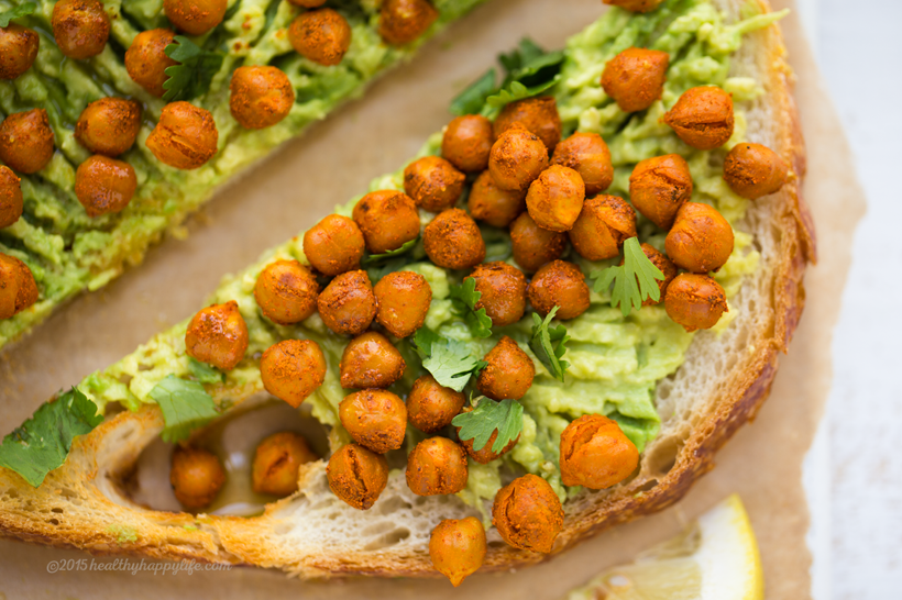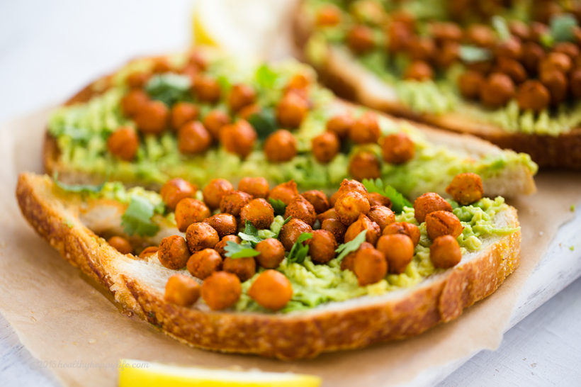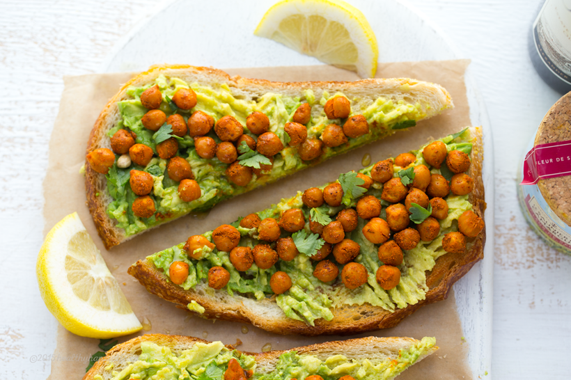 This spin on avocado toast, infuses some extra protein and fiber from spiced, smoky skillet-sizzled chickpeas.
