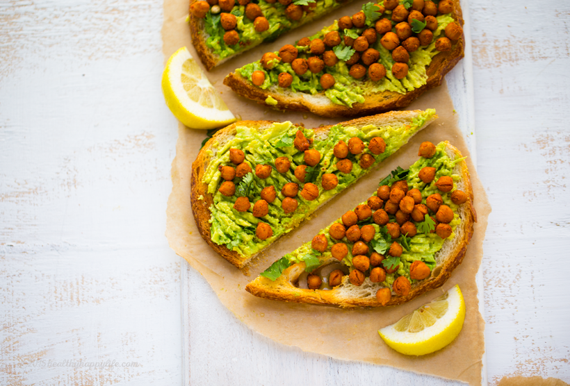 2. Toast the bread and using a fork, smash the avocado into the toast. Sprinkle the chickpeas on top, add the cilantro or parsley garnish and drizzle EVOO over top to serve. Serve with lemon wedges and squeeze lemon over top as you eat. Slice and serve!