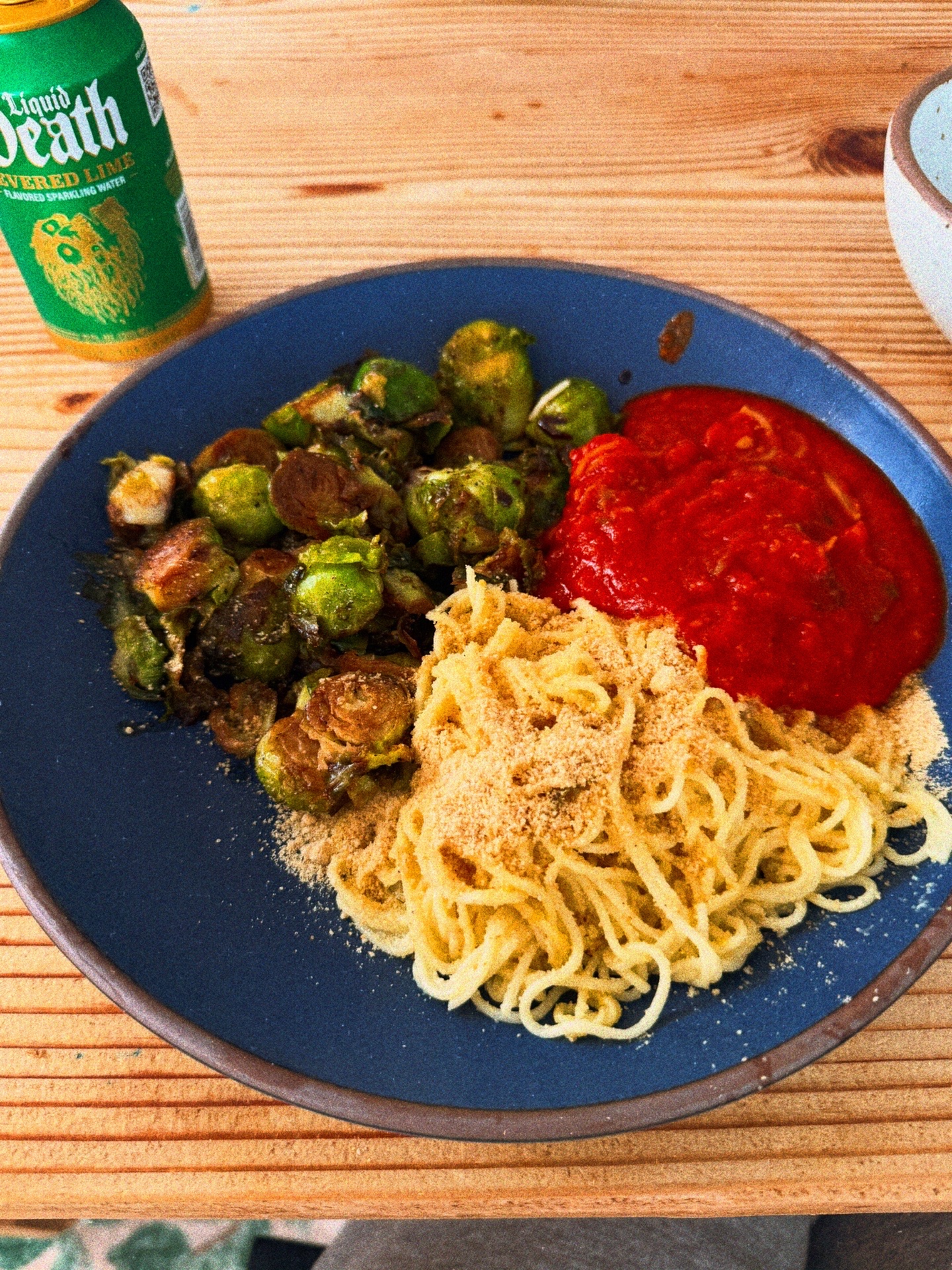 Lately, I’ve been in my angel hair pasta era, probably because it cooks in five minutes flat, and every parent knows that’s a gift. So a typical weeknight dinner for me looks like: pasta twirling on one side of the plate, steamy Rao's sauce pool on the other. Glossy Brussels sprouts on the other, maybe some roasted carrots or beets to round it out. Fast, nourishing, deeply satisfying.
