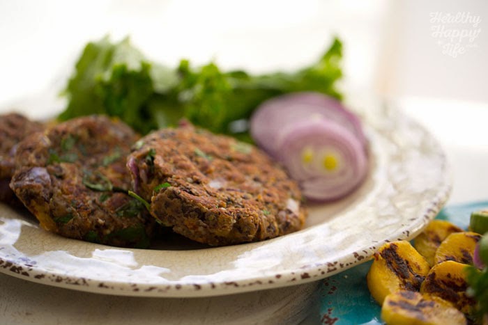 Black bean plantain burgers with onion and chipotle spice.