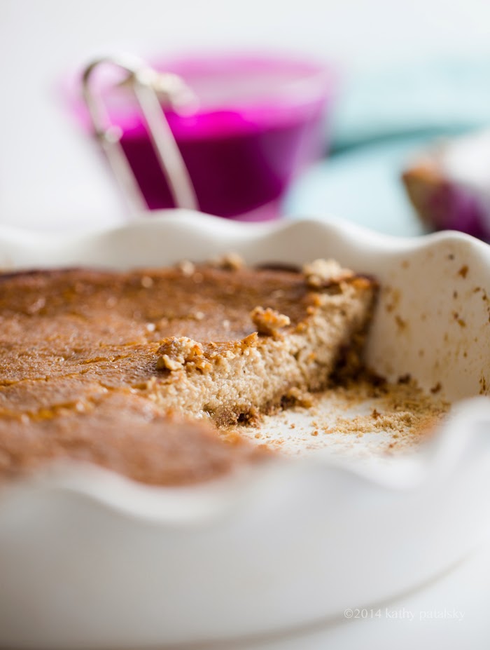- Lightly grease a large and deep pie dish or round cake pan, 9-10 inches in size. Spread the date flour mixture in the dish and press out until a ⅛" thick crust forms. Set aside.