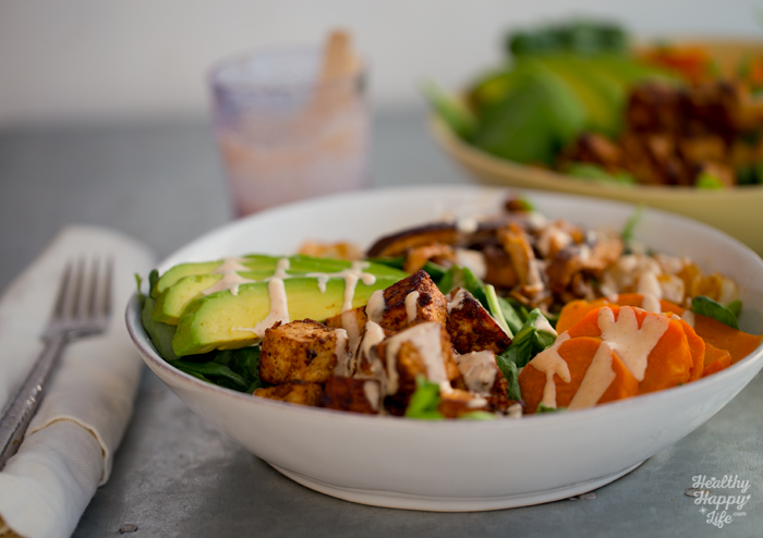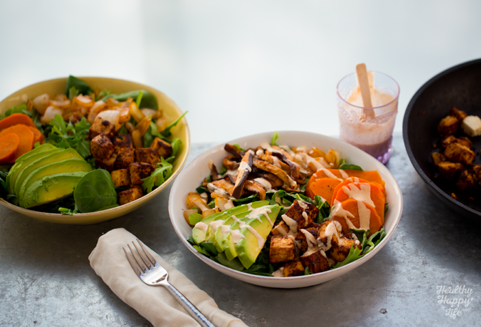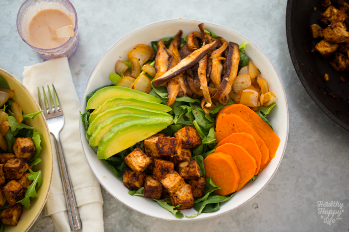 - Ready to assemble! Add two cups of greens to each serving bowl. Then add the sliced avocado and slices of cooked sweet potato. Then add the onions and mushrooms. And finally, add those sizzling hot tofu cubes. Drizzle the creamy sauce on top and serve! Optional: add nutritional yeast and lemon sprinkle over top!