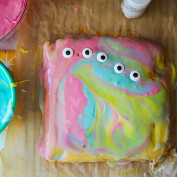 - When cake is cool, swirl the different colored frostings over it. Then add candy eyeballs! Serve!