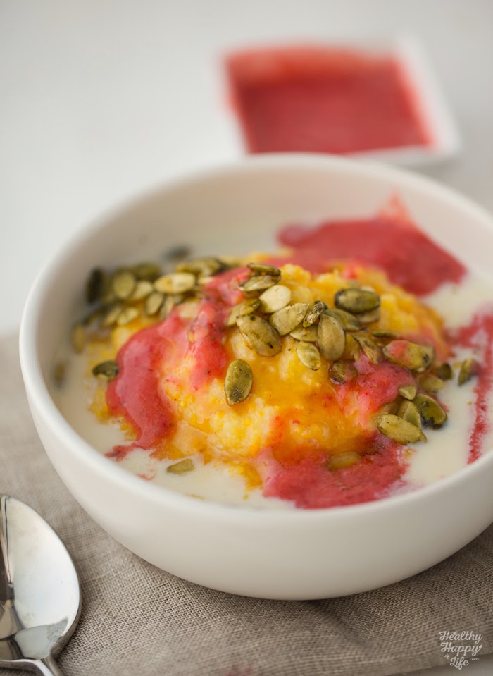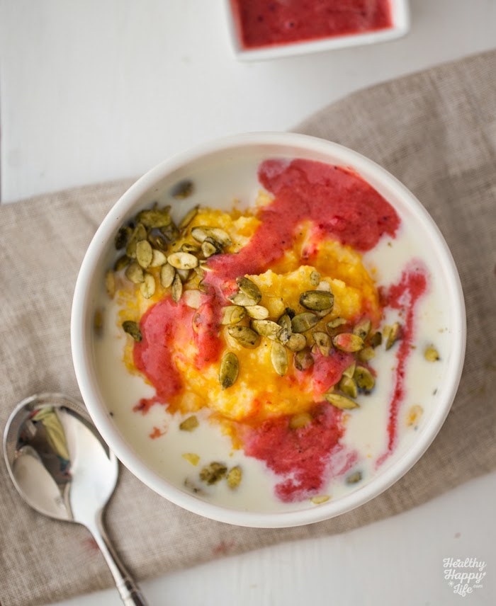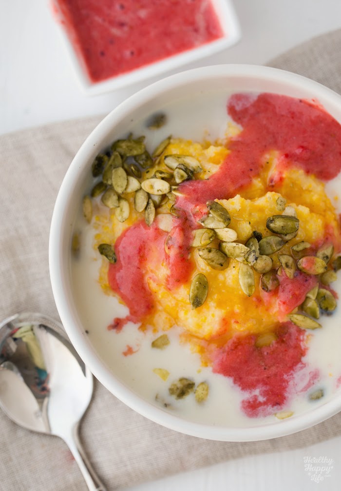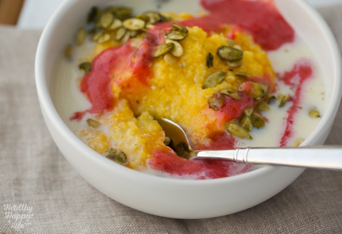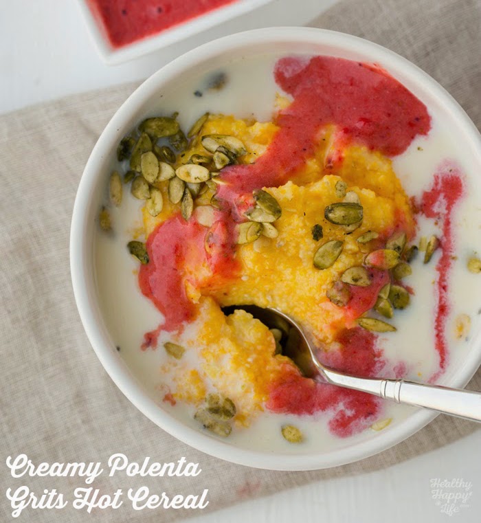 Polenta breakfast cereal, warm and cozy. New fave. Freeze dried blueberries, hemp seeds, almond milk, coconut sugar & @earthbalance on top ☕️A photo posted by Kathy / HealthyHappyLife (@kathypatalsky) on Feb 4, 2015 at 10:59am PST