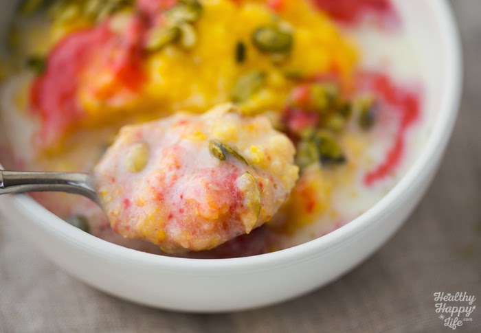 - Turn off heat and pour polenta grits into two serving bowls. Top with the pumpkin seeds, non-dairy milk and swirl strawberry sauce over top.