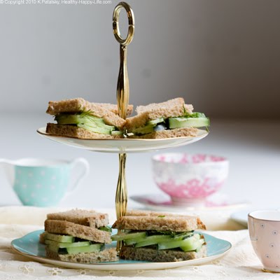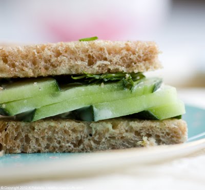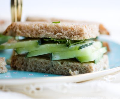 I watched my mother all morning in the kitchen as she stuffed tiny slices of butter, fresh sprigs of mint and thick crisp slices of cucumber between small, de-crusted triangles of white bread. Each tiny sandwich was big enough for one bite, finger sandwiches. And today, with a bit of research, I found that this is a classic old English recipe - posted all over the web.