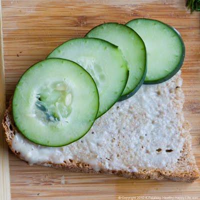 1. Whip together the spread, thinly slice the cucumbers. You can do thick crunchy slices, or thin silky slices - your choice. Gather your fresh herbs, rinse and pat dry.