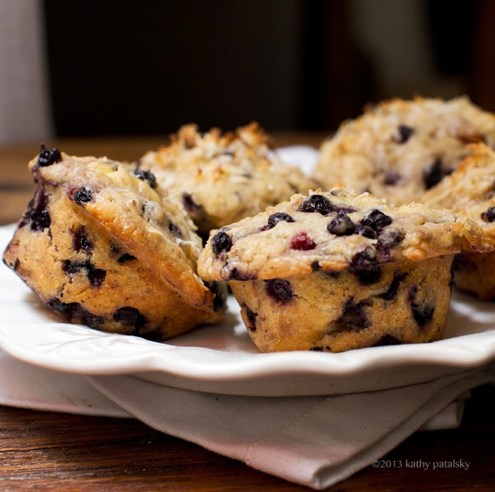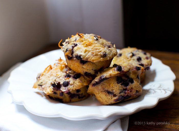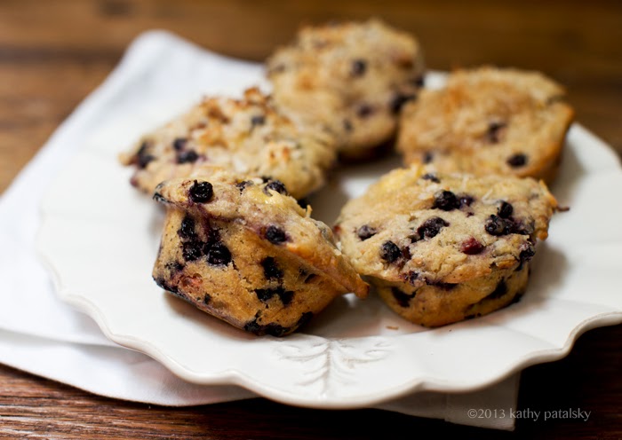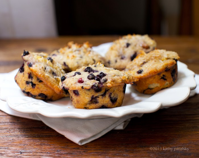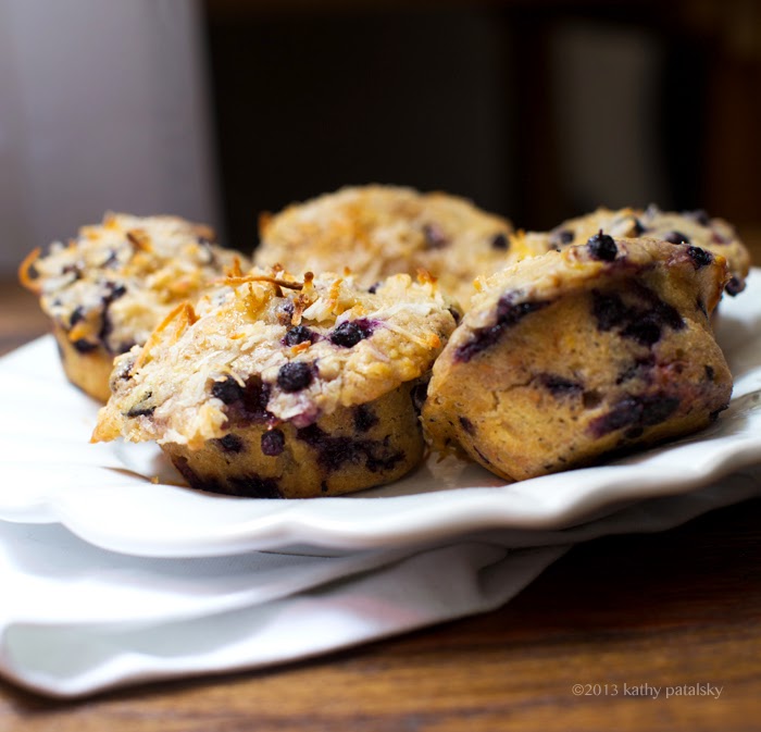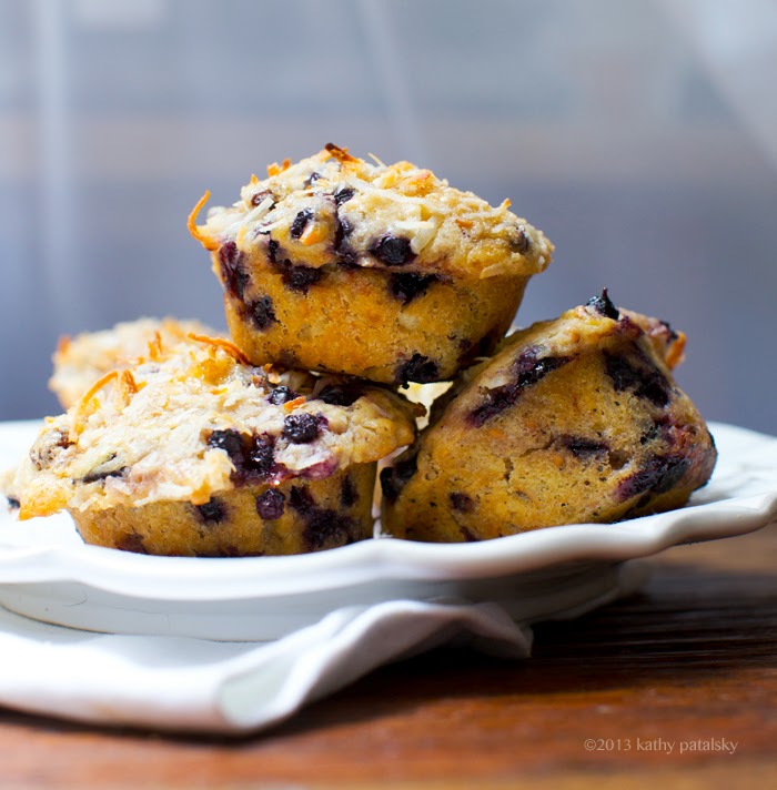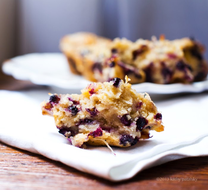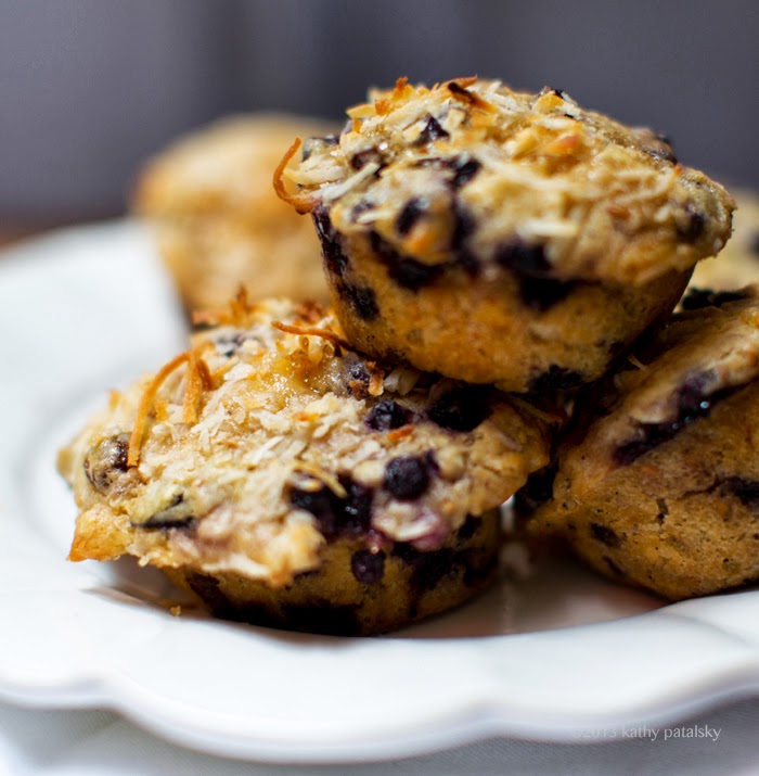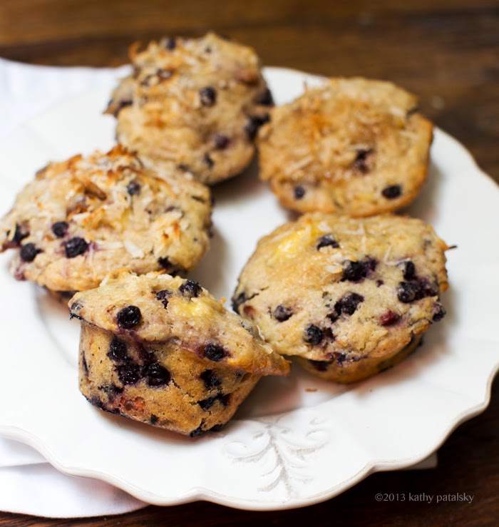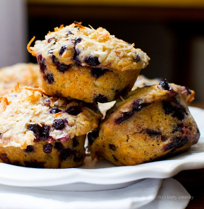 These muffins have crispy caramelized edges from the coconut oil-greased muffin pan. No liners, let them crisp in the hot pan. With all that coconut oil, they will not stick to the pan. These muffins are more buttery and moist than they are "sweet." They are rich and blueberry-blue swirled and totally amazing. Time to bake with gusto and whip up these dreamy vacation-inspired gems...