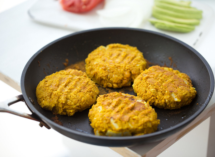 These golden burgers are a bit of a recipe nudge to anyone who has not grabbed a copy of my new book, Healthy Happy Vegan Kitchen. Because the first veggie burger recipe in the "burgers" chapter is a recipe almost exactly like this one. And SO good I wanted to make them and show them off on the blog .. and give them a few photos, since that recipe is photo-less in the book.