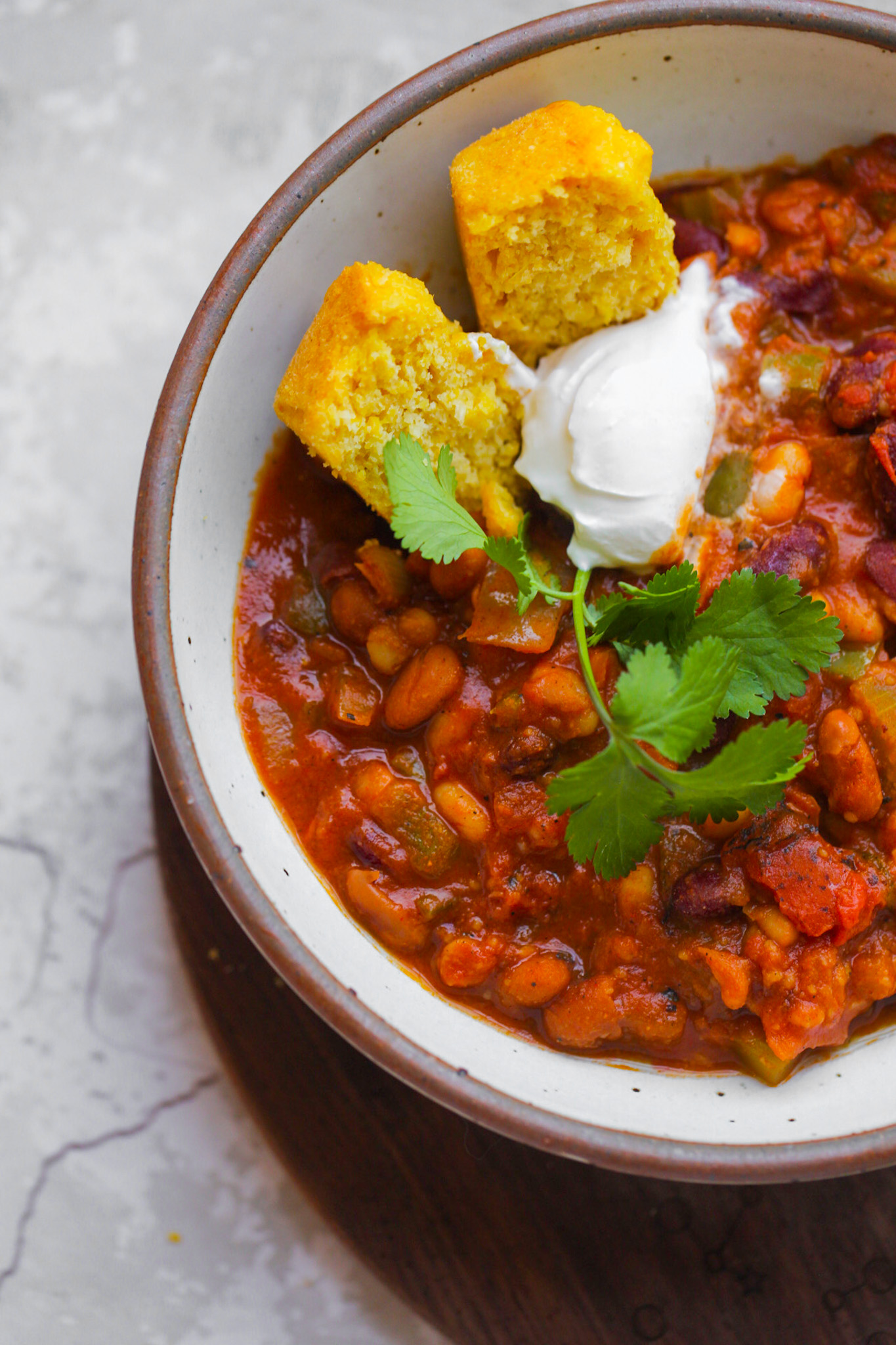 - Serve chili piping hot with desired topping on top. Try fresh cilantro, corn bread, peanuts, corn chips or vegan sour cream or shredded cheese. Store leftovers in the fridge for up to one week.