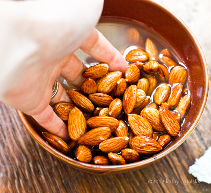 - Allow the almond to soak in a big mixing bowl filled with water overnight or for at least a few hours. Quick soak method: Add your 1 cup of almonds to a bowl and fill with about 3+ cups of HOT HOT HOT water. Enough to cover nuts generously. You could use boiling or simmering water, but I just use the hottest possible setting on my tap. Add in a dash of salt and swirl water. Let this sit for at least 20-30 minutes. I think one hour is a bit better, but I have even tested a 15-minute soak that does work.