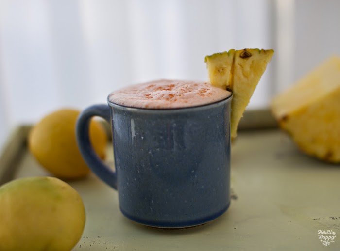 So yes, today's theme: eat more plants! And that includes today's recipe, adding whole fruits to one of the most popular beverages out there: Lemonade! You do not need loads of sugar to sip on a sweet and amazing lemonade. Pineapple is so rich in natural sweetness, that it easily adds all the sweetening your lemonade needs. And pineapple and lemon juice is a pretty fantastic combo, so I hope you give it a try this spring and summer.