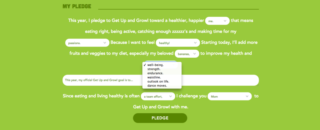 If you want to try to eat more fruits and veggies this year, join in the Get Up and Grow fun and take the online Pledge for wellness! I love all the options to customize your pledge..