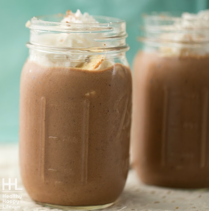 frosty chocolate shake with hot cocoa and banana flavors, soy whip on top!