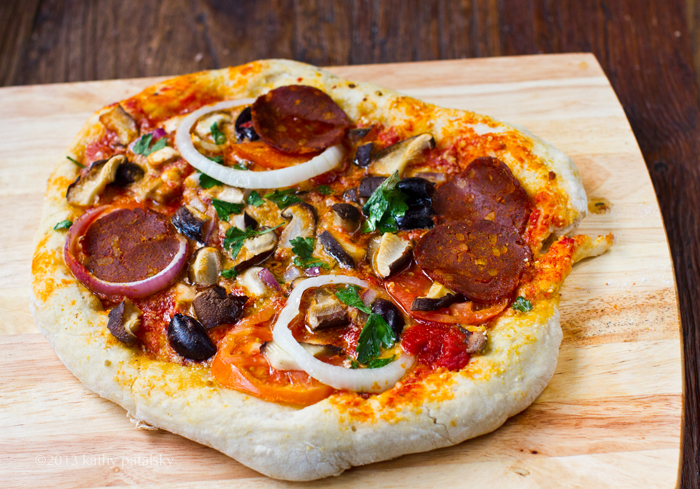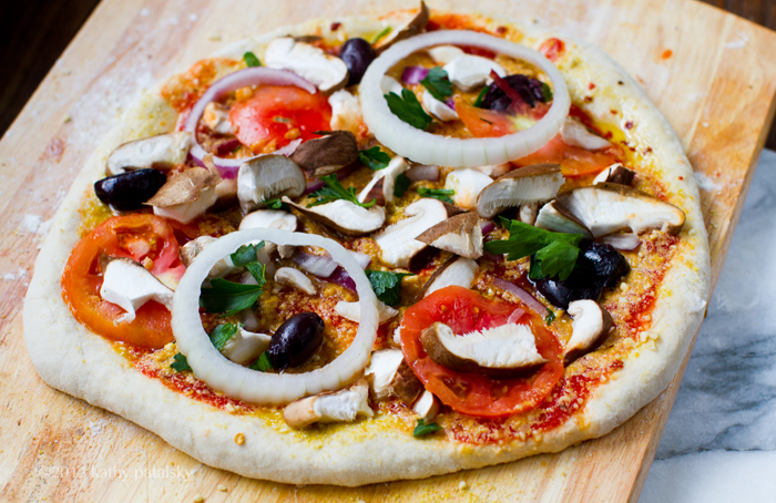 ..This pizza included some of my fave toppings including shiitake mushrooms, sweet onions, vegan pepperoni and kalamata olives. (I also LOVE squeezing fresh lemon juice on my pizza before baking!)