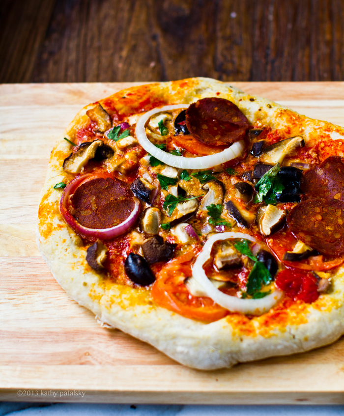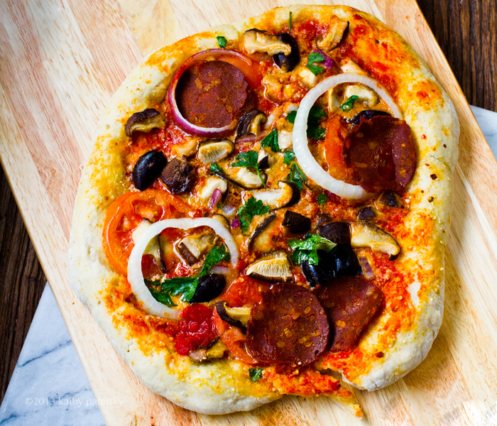 Below you will find sauce, dough and Parm recipes. For the toppings you can really use whatever you love. My faves: shiitakes, kalamata olives, chopped pineapple, freshly sliced tomato, sliced sweet onion, fresh basil, kale, vegan pepperonis, EVOO and more.