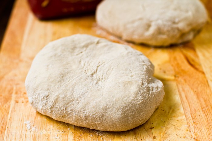 4. In an hour or so, punch out the dough, add a few pinches of flour and start kneading the dough. If you are making two mini pizzas, split the dough into two balls.
