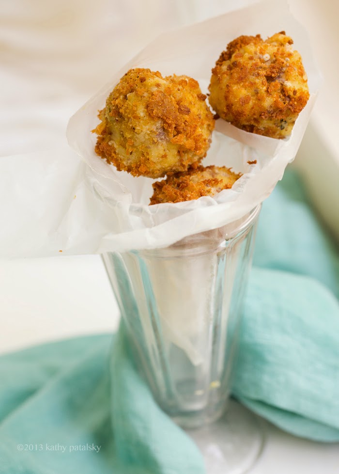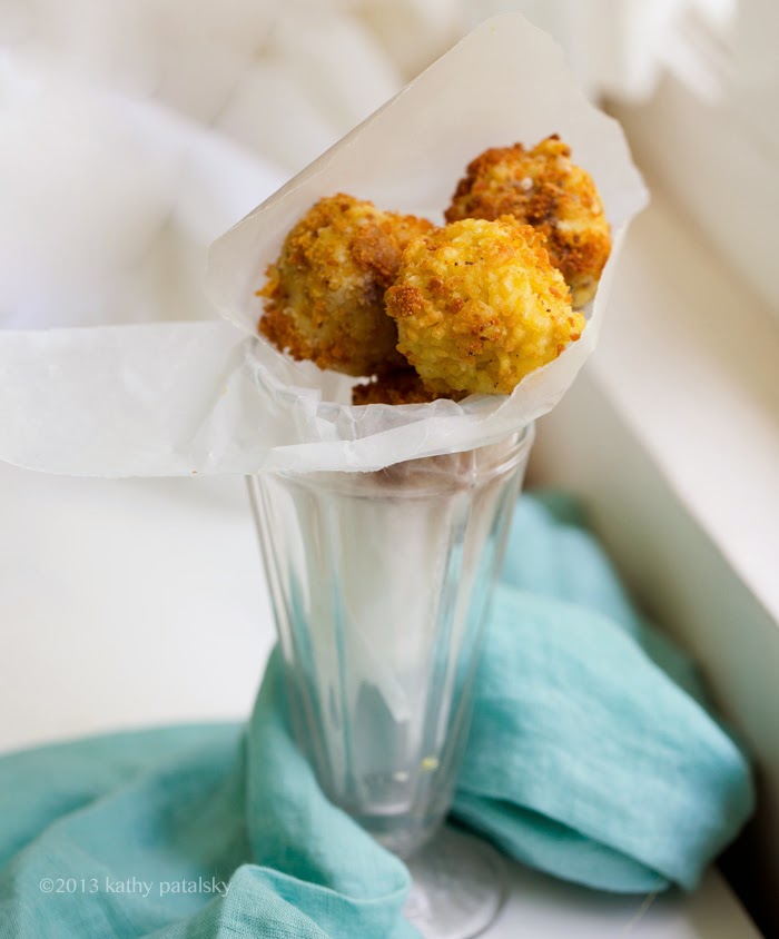 * Can I Bake Them? Yes. I think. I have not tried this yet, and quite honestly I think they will have a very different taste and texture. The fun of Arancini is the moist and delicate insides mingling with the light and airy fried coating. So give baked a try if you want, but I would drizzle the balls in plenty of EVOO before baking in the oven so they stay a bit moist and pleasantly crisp. So even if you are like me and avoid "fried foods" make these the classic way and enjoy them as an occasional treat. To stay guilt free, serve the balls as an appetizer - a side - just eat 1-3 small balls, not the whole plate. (Even though you will want to!)