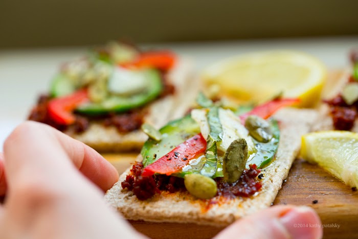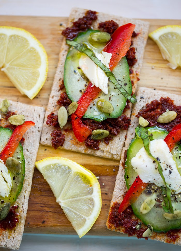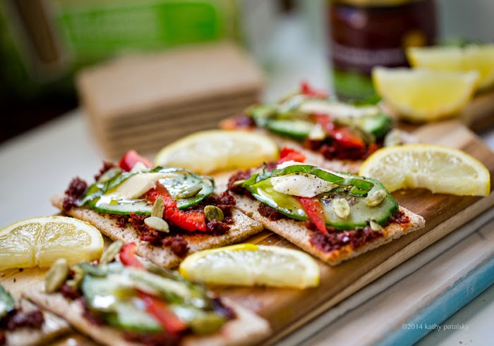 My Fire & Ice Appetizer combines a slathering of warm and spicy tomato harissa spread with cool thinly sliced cucumbers, fresh basil, lemon, cracked black pepper, a drizzle of fine extra virgin olive oil, a nibble of rich vegan jack cheese and some nutty sprouted pumpkin seeds, all sitting on a bed of the most amazing light and airy 100% buckwheat cracker of all time. Serve this spicy gem and hang out at the snack table (along with everyone else) at your next party or gathering. These snackages taste DIVINE when paired with fizzy sparkling wine, kombucha or a fresh OJ-infused mimosa. Let the Le Pain Quotidien fun begin..