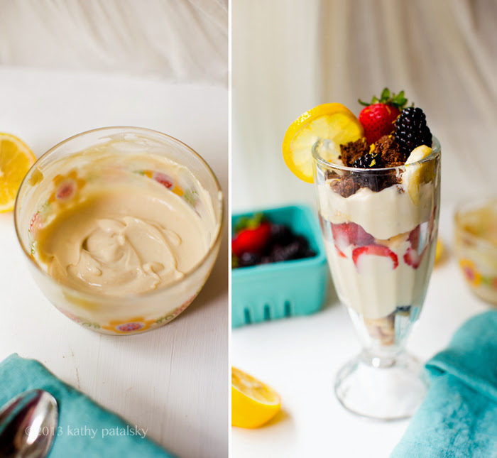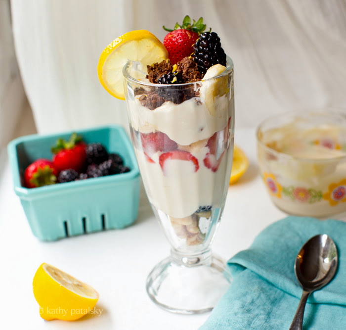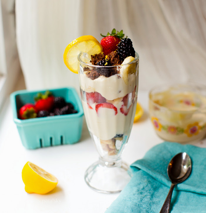 7. Serve by assembling your parfait in layers. Alternate add berries and crunchy toppings to a tall parfait glass. Garnish with a few pretty berries and a lemon slice.