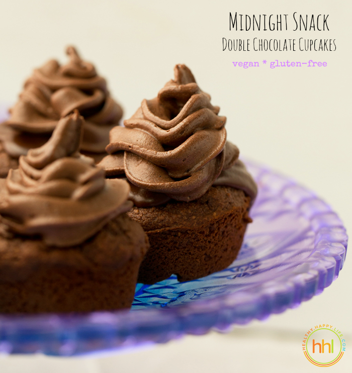 Wouldn't it be nice. If there had been a tall, glittering platter of these Midnight Snack Double Chocolate Vegan Cupcakes. I would have grabbed just one and stood there in the kitchen nibbling its rich chocolate layers, the accents of vanilla, coconut and hazelnut infusing my groggy mind with sweet dreamland thoughts. And back to bed I would have stumbled, a happy happy girl.