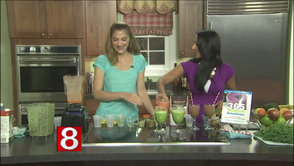 Sitting at my desk, sipping a morning turmeric-strawberry smoothie, still in my pajamas and surrounded by napping kitty cats, I am reflecting on the busy long weekend I had. It was all a fantastic blur as I packed my Blendtec (and two blender containers!) in my suitcase, darted off to Connecticut via a red eye flight, met up with my sister and her cuties, took a stopover in NYC and had a rushed trip back home. But it was all exhilarating, fun, amazing and totally worth all the planning and travel stress because I was able to complete my very first TV appearance featuring a fun trio of smoothies demo on Connecticut Style, on ABC WTNH Channel 8, New Haven. Check out my whirlwind trip, hear my ten happy things that happened and watch the video as I blend smoothies from my book 365 Vegan Smoothies!
