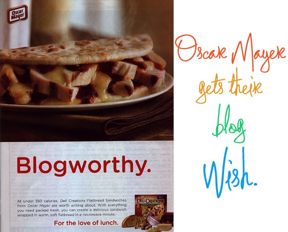 Oscar Mayer recently posted this full page ad in Newsweek claiming that their new Deli Creations Flatbread Sandwich kits are "blogworthy".