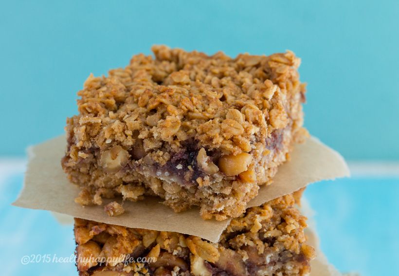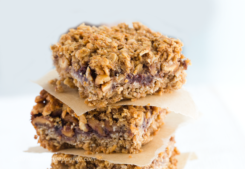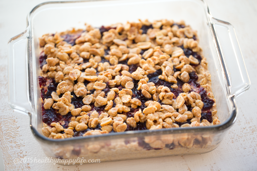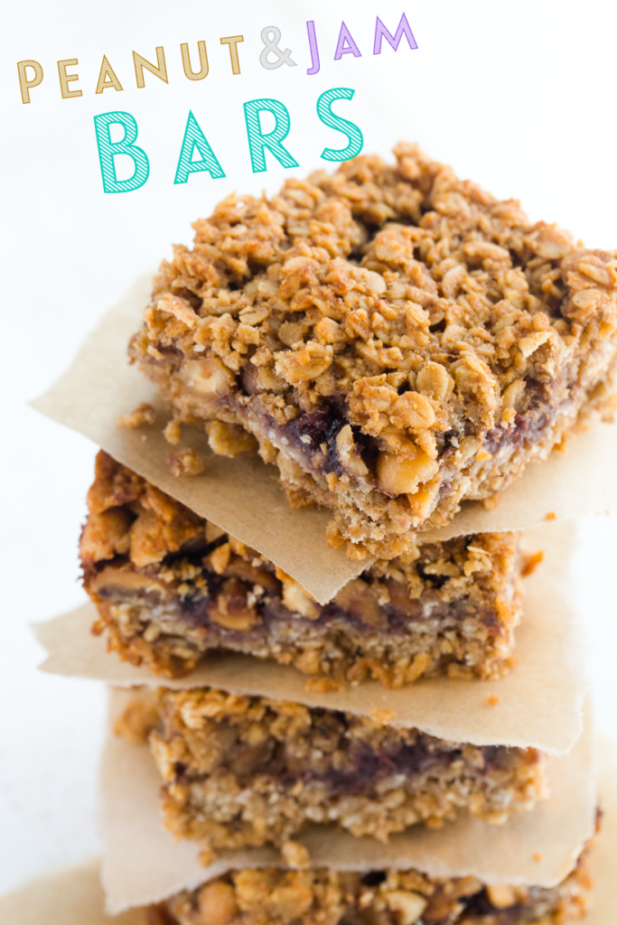 These tender, crumbly bars have a sweet peanut butter and jelly-ish flavor, and loads of complex carbs from the whole grain rolled oats.