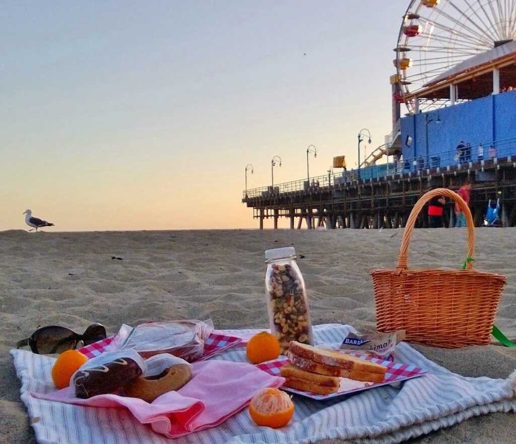Beachy Picnic. This peach and provolone sandwich is a dreamy dish for summer. And vegan cheese sandwiches taste so good on a picnic! I admit that grilled cheese isn't the best option for a beach picnic, but since we didn't travel too far for this sunset hour Santa Monica beach picnic, the cheesy sandwich traveled quite well. I made and packed it right before we left. The PB&J traveled perfectly as well.