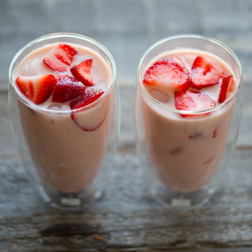 Starbucks uses freeze dried strawberries in this. Love the power of the Medjool dates to sweeten it up.