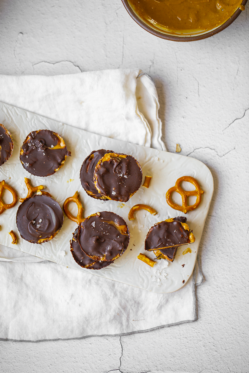- Remove from freezer and add in a teaspoon of peanut butter and a pinch of pretzels - just enough to have a few sprinkled throughout. Top with another dollop of chocolate. Smooth tops. Repeat with all cups. Sprinkle coarse sea salt over top.