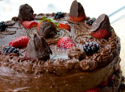 Chocolate covered Chocolate. I'm actually not a huge chocolate person, but I know that a double chocolate layer cake with creamy dark chocolate frosting will make a chocolate-lover drool with delight. This recipe is hardcore chocolate. But if you are looking for a lighter version, I suggest making the cake layers strawberry flavored. You'll still be keeping in the "chocolate-covered-strawberry" theme. Or do one chocolate and one vanilla layer to tone it down a bit. Your choice!