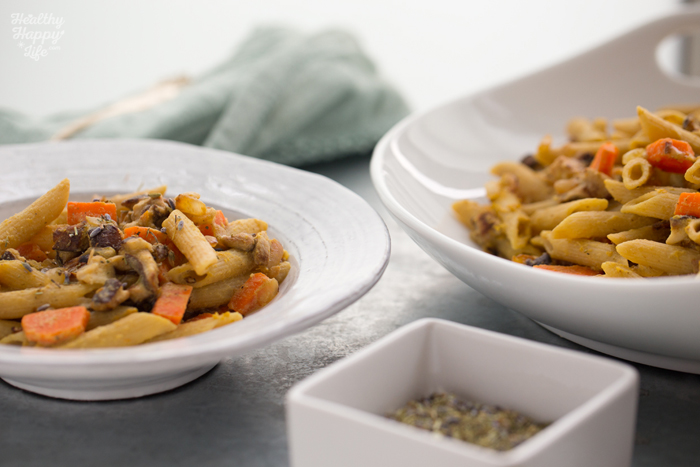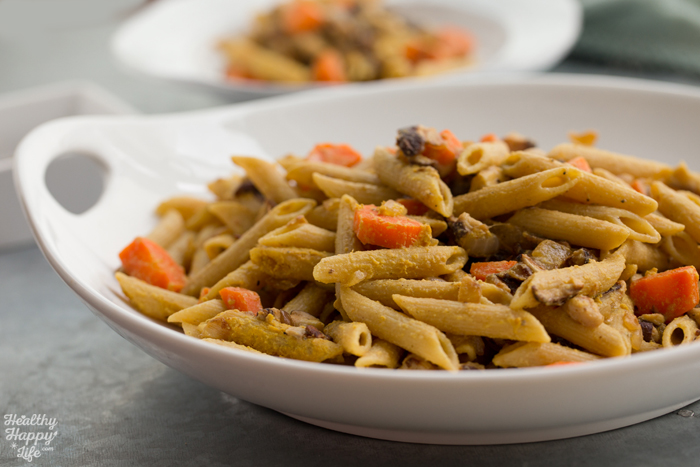 - If you have not yet drained the pasta, do so now and add the cooked carrots and pasta to a large mixing bowl. Pour the blended garlic sauce over top and add the nutritional yeast. Toss well. Then fold int he veggie mixture.