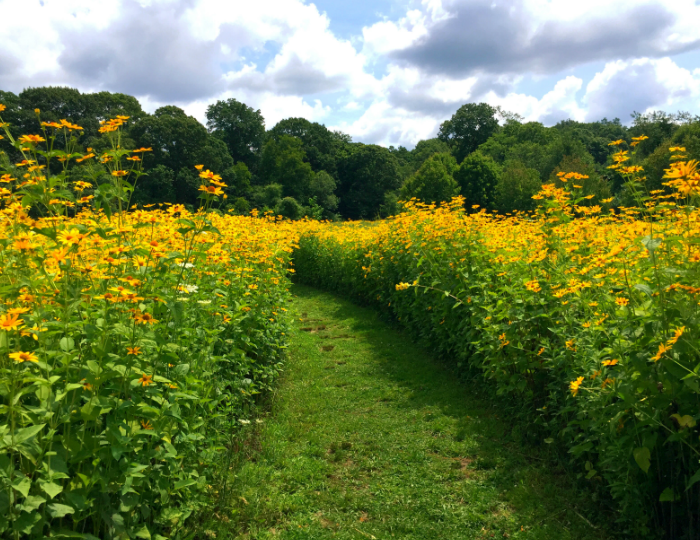 Vacation time flower-field skipping.