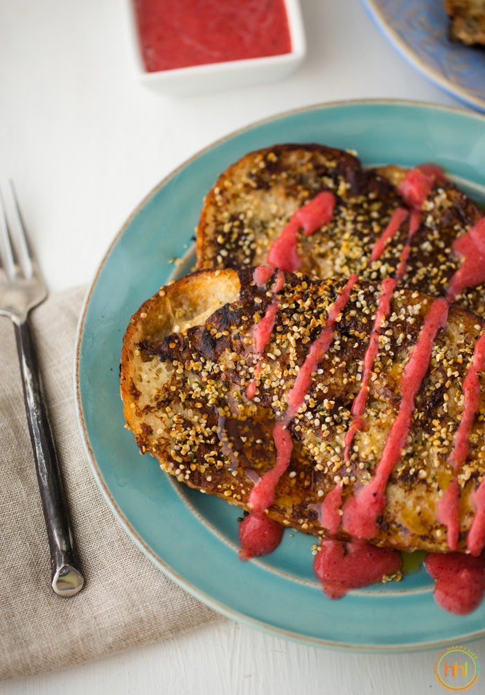 Super simple vegan french toast that is perfectly light, fluffy, delicious and sublime. Hemp seeds sprinkles, cinnamon and vanilla. Plenty of maple and strawberry swirl on top.