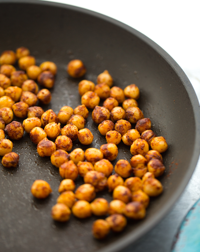 - For the chickpeas: Warm a skillet over high heat and add oil. When oil is hot add the chickpeas. Saute for 2 minutes, then add the spices and sweetener. Shake pan ever few seconds to evenly distribute the spices. Cook until the chickpeas begin to blacken a bit. Remove from skillet.