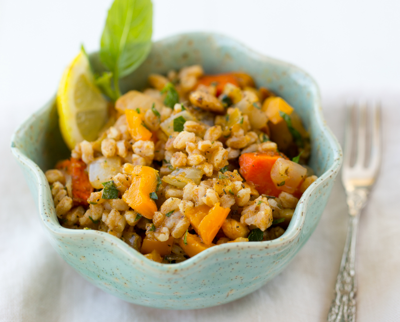 Use your favorite summertime veggies (squash and more!) to make a big batch of this farro salad. I make a big batch ahead of time and store in the fridge to serve all week long. Though it is so good it usually only lasts a few days! Delicious and healthy for a light snack or nibble too! If you have never tried farro, this is a great way to discover how wonderful the flavor and texture it. You could also sub with brown rice, millet or another grain of choice.