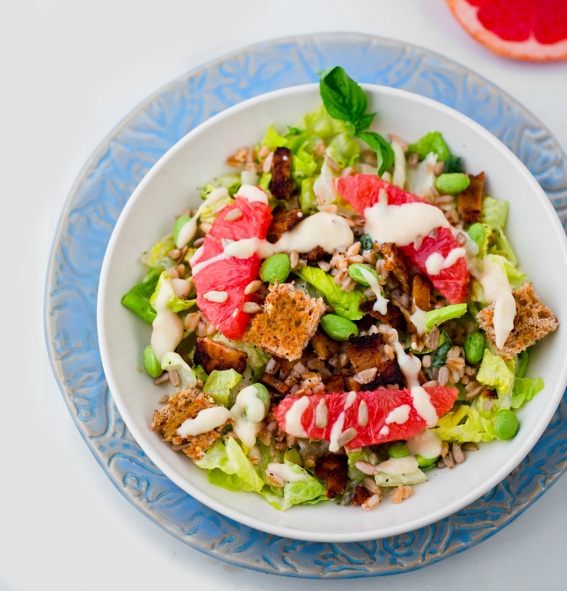My vegan spin on a summertime Caesar salad! This is an entree salad with protein, whole grains, loads of greens, citrus and an amazing dressing.