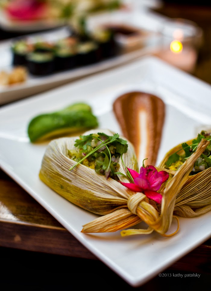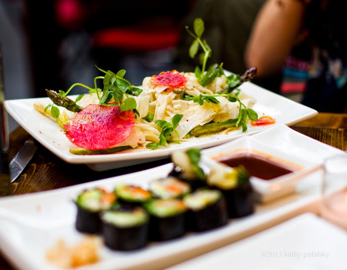 Pure Food and Wine is a place where towering raw zucchini lasagna with its bright green pesto and glossy layers, vibrant vegan salads, the best vegan tamales you have ever tasted, velvety Mallomars and rippling Chocolate Mint Sundaes are carried out on shiny dishes by passionate people, amidst twinkling lights, glowing faces sipping Sake Tinis and a hum of something magical in the air. Kind of like Disneyland for people who like plants. And in place of Walt, we have miss Sarma. In the place of Mickey, we have a duck. A duck logo who Sarma says she created with kid-appeal in mind,