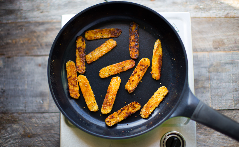 - When oil is hot, add the tempeh. Cook 2-4 minutes, enough time to lightly brown on both sides, flipping a few times throughout.