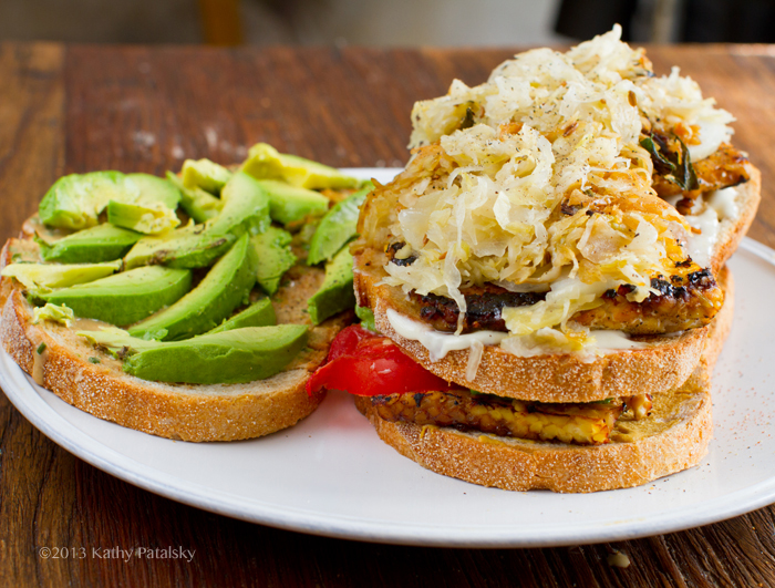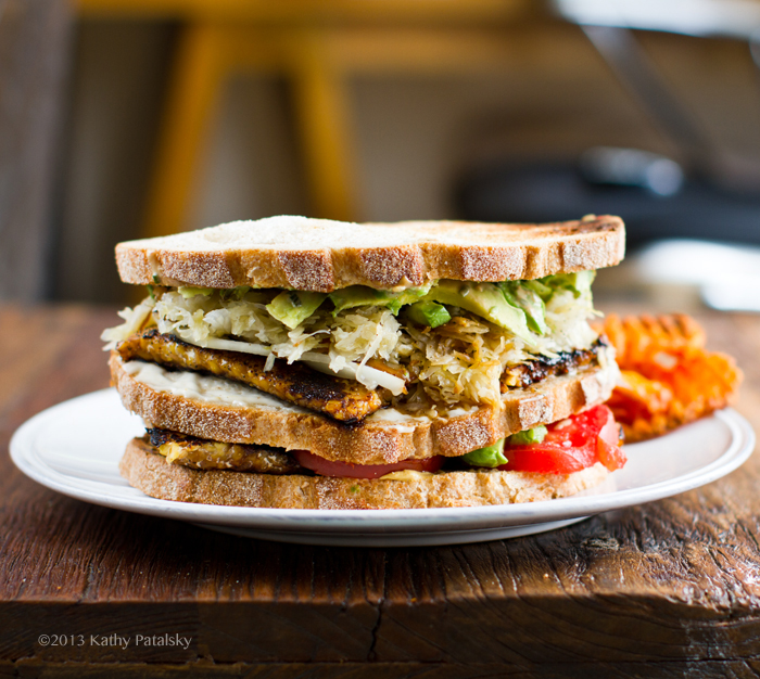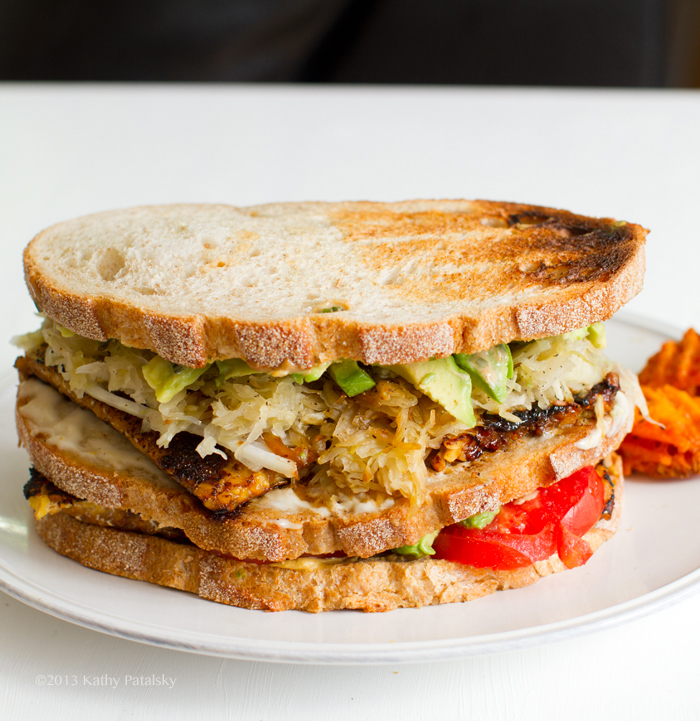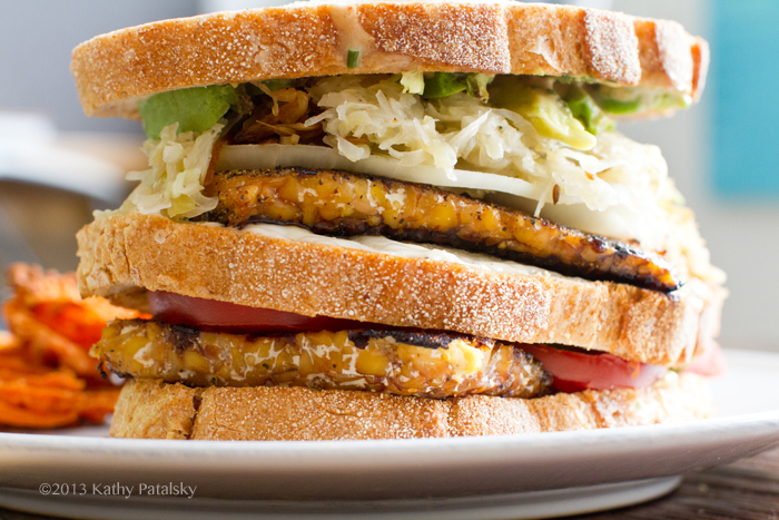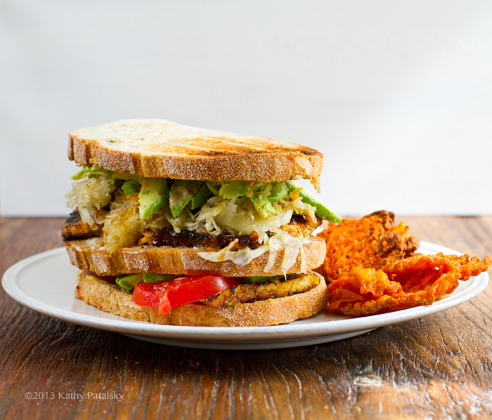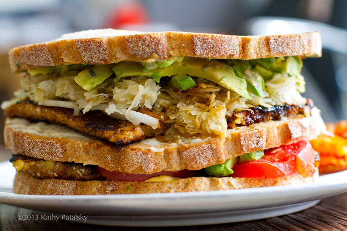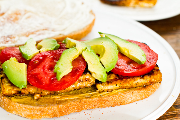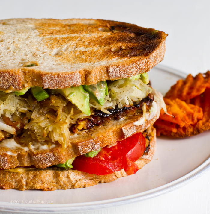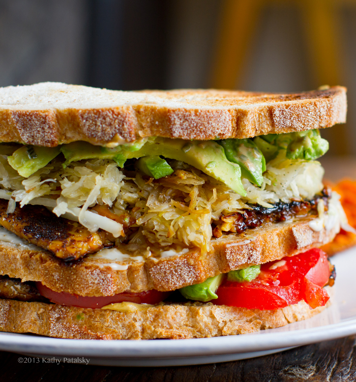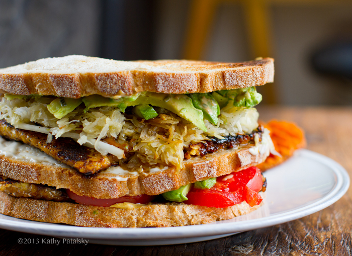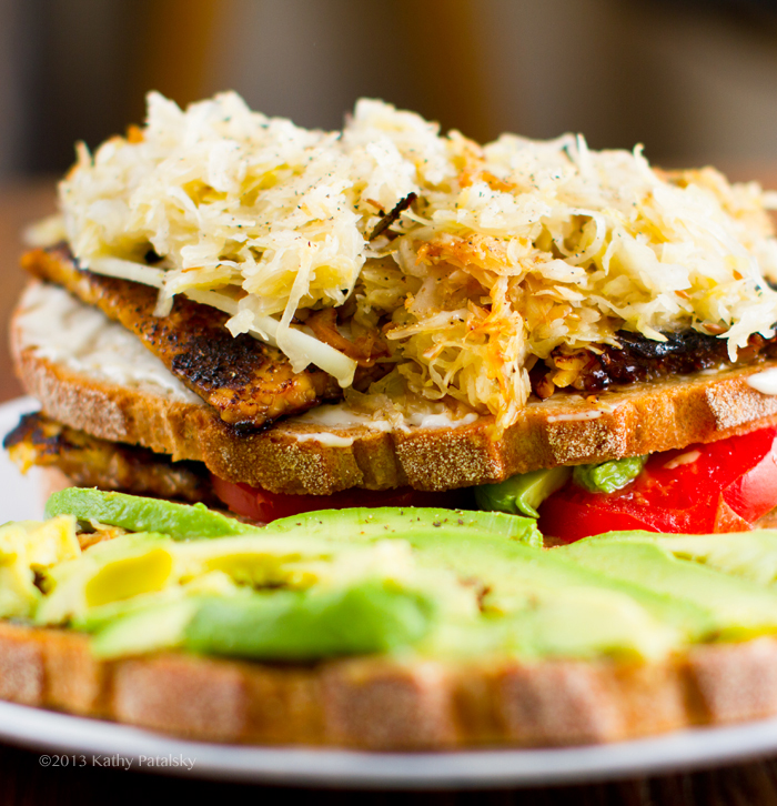 5. Start stacking! Add one layer of tempeh, then some tomatoes on top. Then add the avocado. The avocado will happily mush into the dry bottom of the middle layer of toast you stack next. Add middle toast. Then another layer of tempeh, onion, and all that heavenly kraut. Last, add more avocado and the top layer of toast.